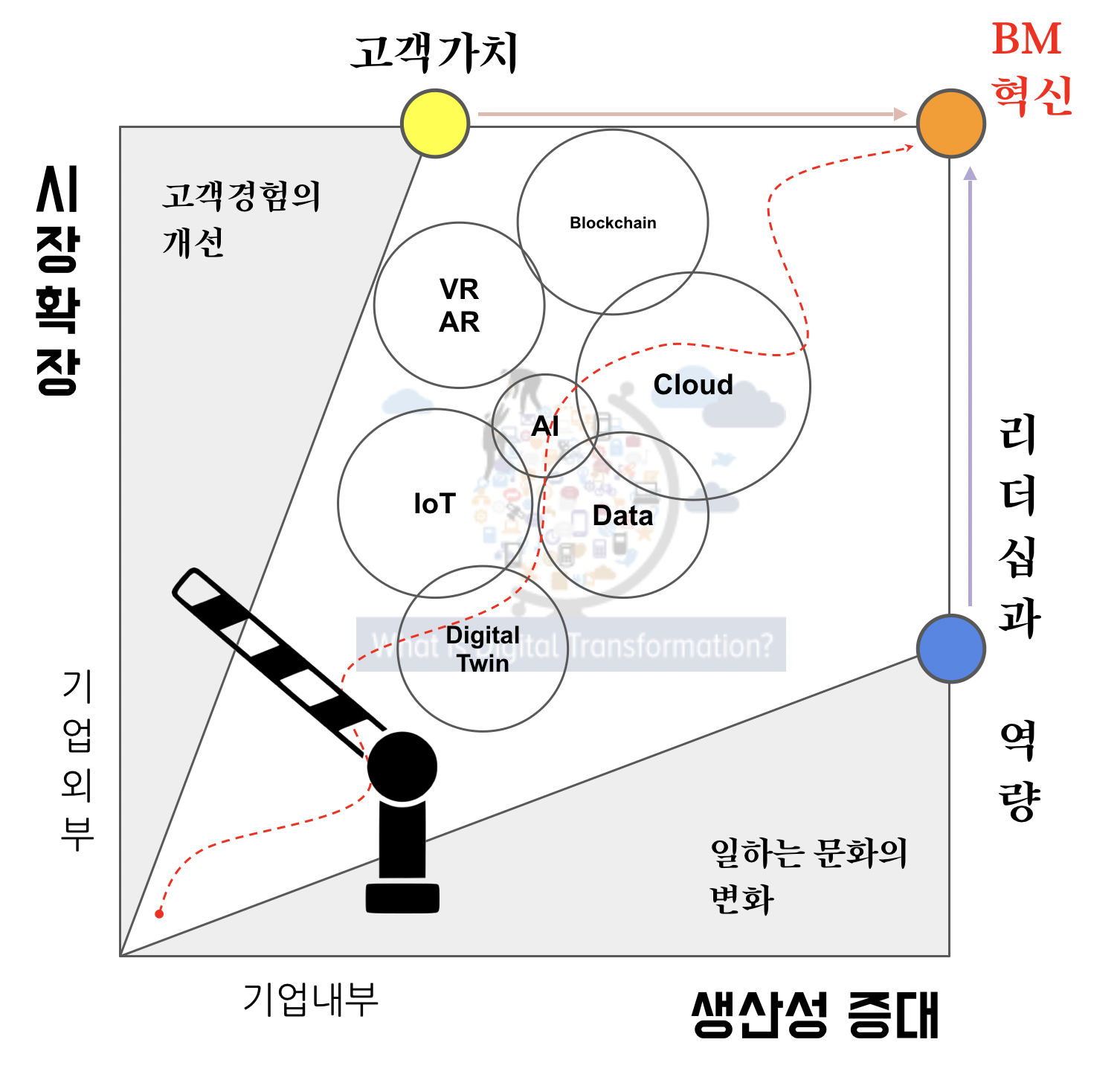 디지털 트랜스포메이션의 목적은 기업의 성장입니다. 성장하기 위해서는 혁신이 필요하며, 이때 사용하는 도구로서 디지털 기술을 활용하고자 하는 것이 DT입니다. 그런데, DT를 추진하는 과정은 단지 기술만 가지고 되는 것이 아니라 이 기술을 도구로서 잘 사용하고자 하는 의지와 역량이 중요하죠. DT는 도구일 뿐이며 결국 도구를 쓰는 것도, 잘 활용하는 것도 사람의 몫입니다. DT는 기술을 이용해 공장을 바꾸고, IT 시스템을 업그레이드해서 데이터를 수집하는 등의 외적인 환경을 개선하는 것만으로 완성되지 않습니다.