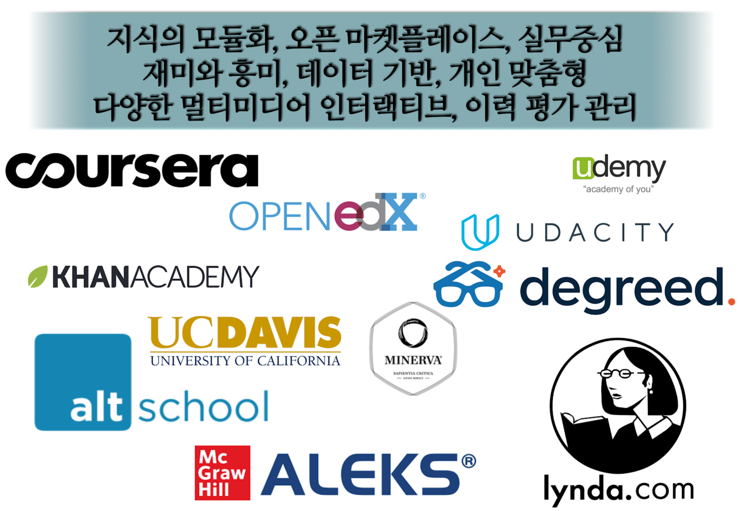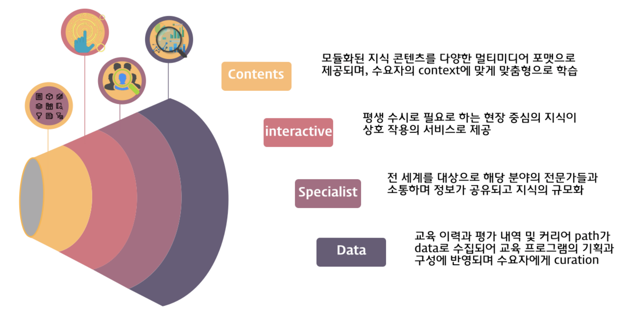 사실 가장 효과적인 교육은 “절실한 필요에 의해 동기부여가 된 시점에" Right Contents를 제시하는 것이다. 그런만큼 이같은 교육 니즈를 가진 개인들에게 최적의 콘텐츠와 지식을 다양한 전문가들이 제공하고, 서로 소통하며 더 큰 지혜로 발전해가는 과정을 도와주는 교육 서비스들이 늘어가고 있다.